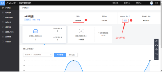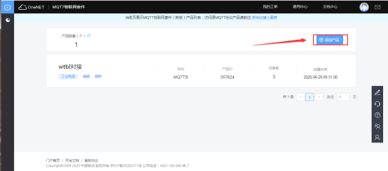 可进入OneNET平台的对应产品中获取网关云服务中心所需要填写的ID和KEY。