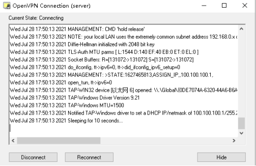 ifconfig-push 100.100.100.2 100.100.100.202 :为隧道地址的两端,默认网关这端的隧道地址为100.100.100.2