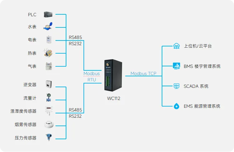WC112,搭载 1 个百兆网口 + 2 个 RS485/232 串口,支持Modbus RTU 转 Modbus TCP,可单总线挂载多台串口设备,自动映射地址区分设备,是能耗采集、新能源监控、智能楼宇、工业自动化等场景的理想边缘通信节点。