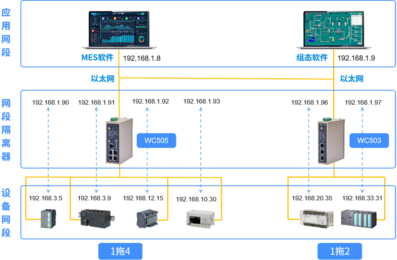 yth游艇会yth206·WC系列网段隔离器(NAT转换网关)适用于生产网络对于PLC、HMI、CNC、DCS、MES等设备和系统进行网段隔离和IP转换,从而实现设备与设备,设备与系统之间的有效防护隔离,顺利获得IP的转换实现统一化的IP规划;广泛应用于智能工厂、矿山、油井等生产网络设备接入场景。