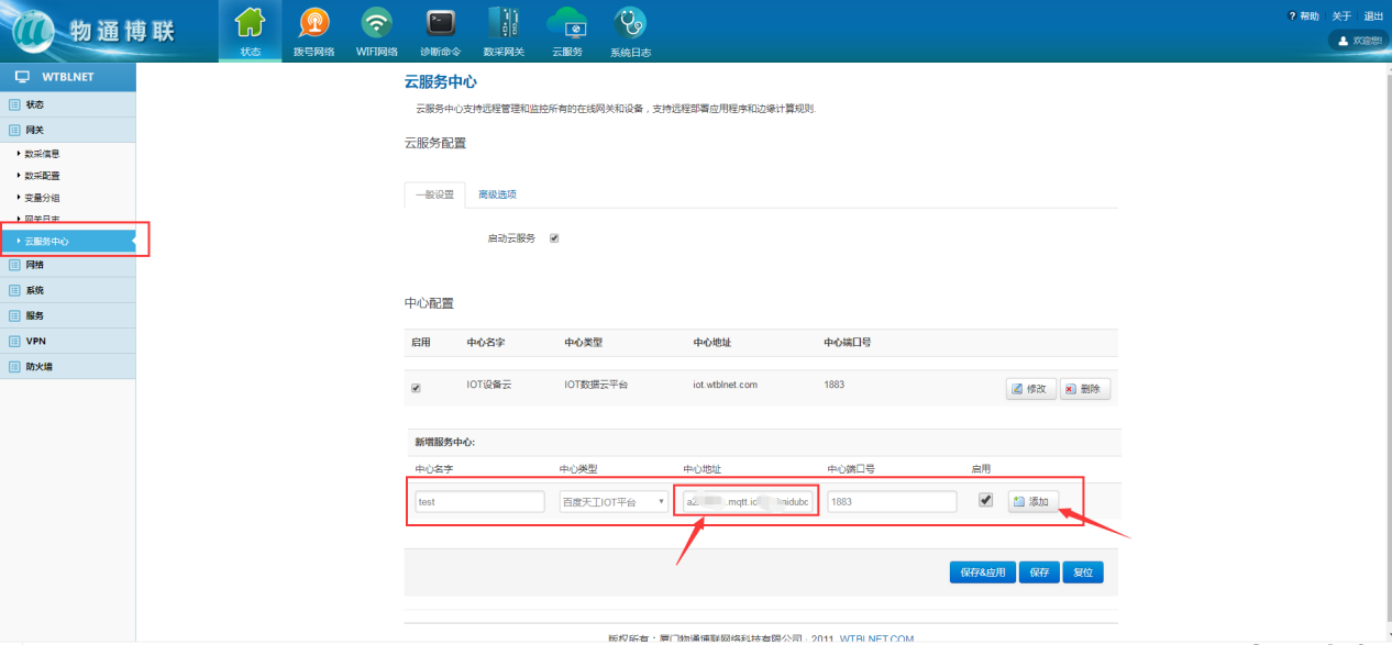 在网关的云服务中心中添加百度天工IOT云平台,建立与百度天工IOT云平台的连接,并将采集到的数据上传到云平台。