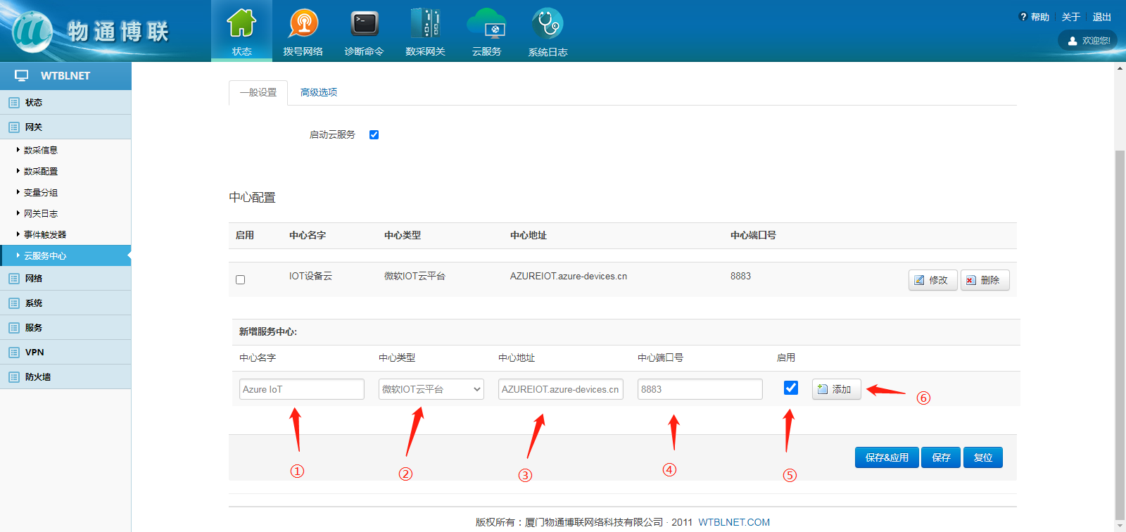 3、打开yth游艇会yth206网关WEB界面,新建一个连接中心,中心类型选择微软IoT云平台,输入相应信息,勾选启用,点击“添加” ,填写对应数据即可实现设备数据上传到微软Azure IoT物联网平台。