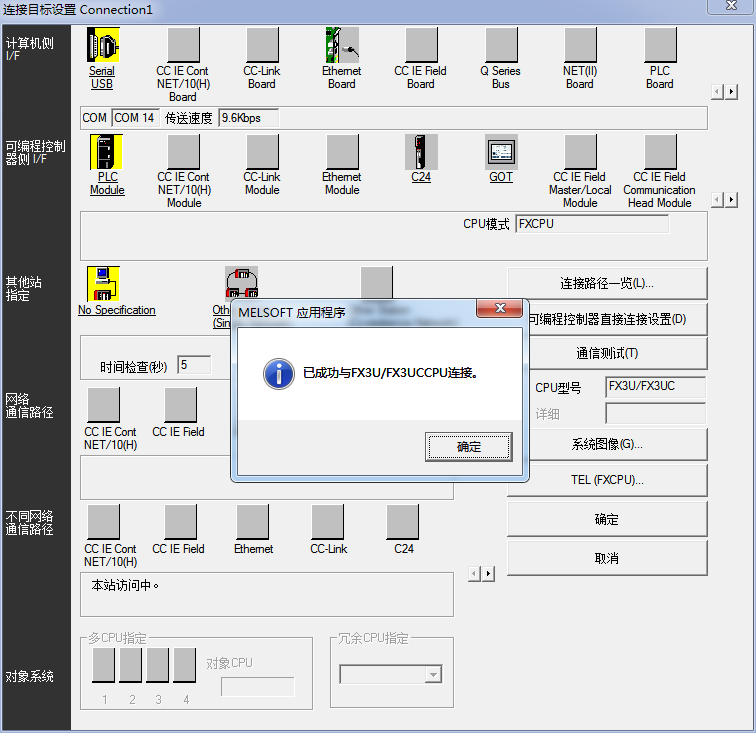 打开 MELSOFT系列 GX Works2,登录 FX3UPLC,设置 FX3U 串口参数,点击“在线”——“PLC读取”——“模块参数”,具体设置见下图: