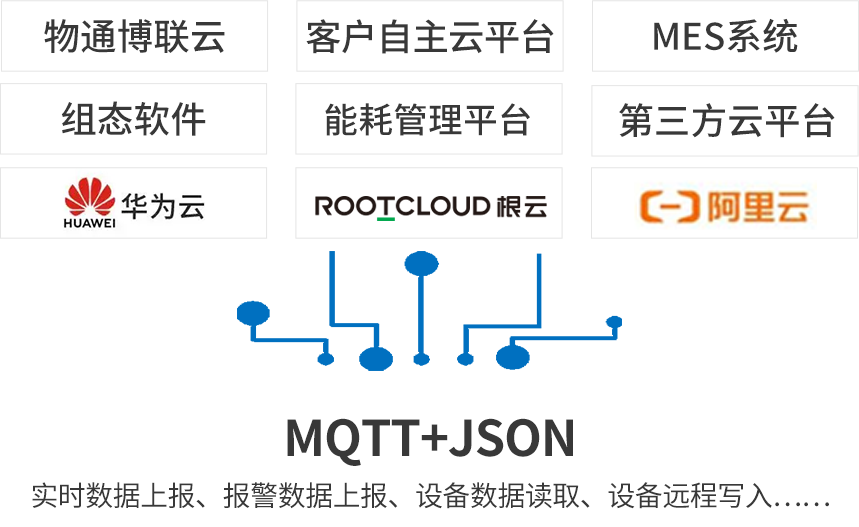 北向支持MQTT协议接入yth游艇会yth206云平台,客户自主开发的云平台,第三方云平台(根云、美云、华为、阿里、百度、微软等IOT云平台),组态软件、MES系统、ERP系统等工业软件