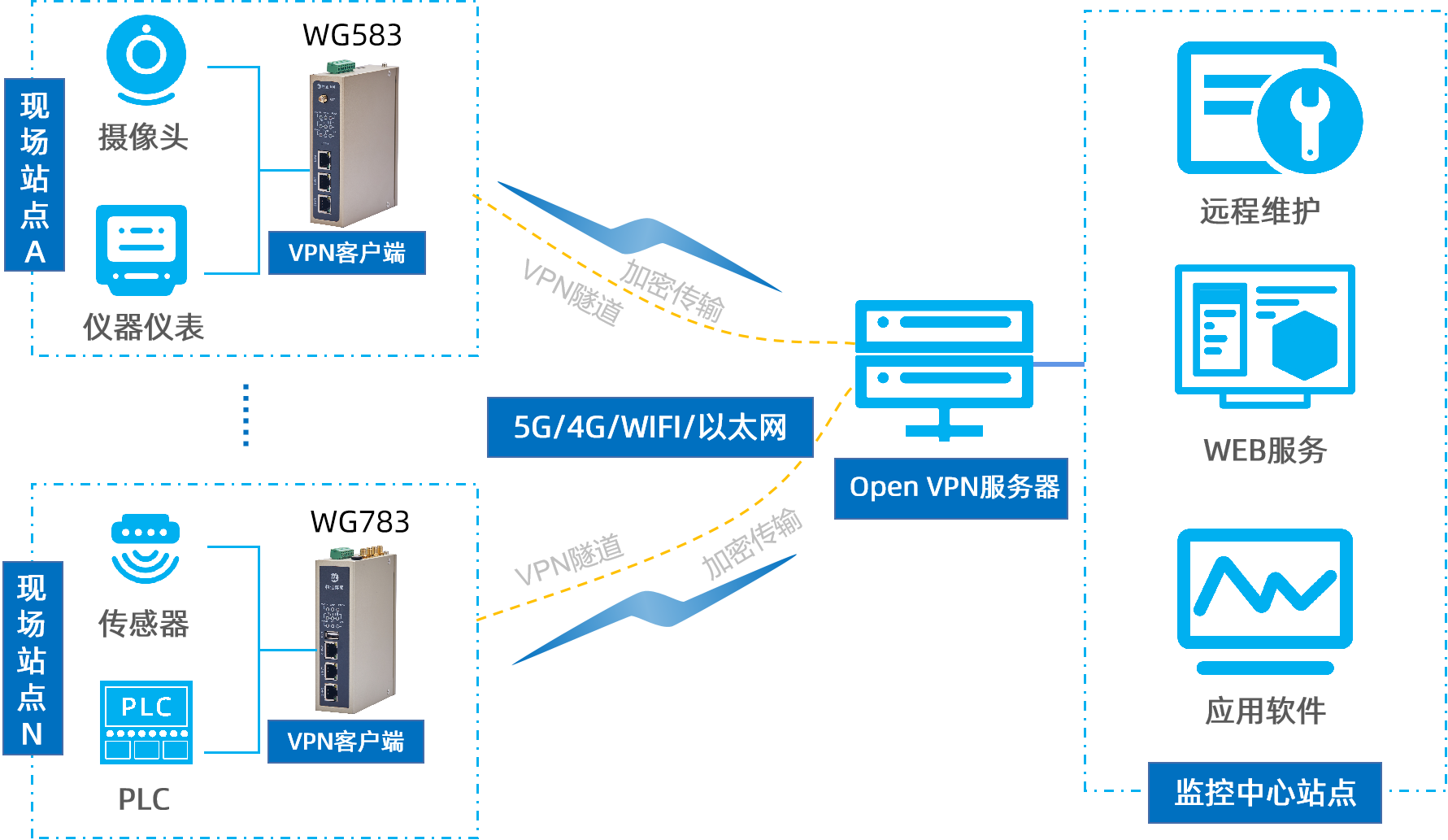 yth游艇会yth206OpenVPN网关顺利获得对工业现场包括PLC、仪表、传感器或者工控机等在内的设备进行实时状态、参数、故障等数据的采集,顺利获得5G/4G/ WIFI/以太网等联网方式将数据上传至服务器进行储存(顺利获得网关为VPN客户端利用OpenVPN技术在原有网络基础上建立一个加密的虚拟网络通道,实现数据加密传输,保障数据的安全性和完整性),即可在数据中心将其显示、分析,从而分析现场环境以及现场设备的相关信息参数以及运行情况,实现对现场设备的远程监控、数据分析、远程维护。