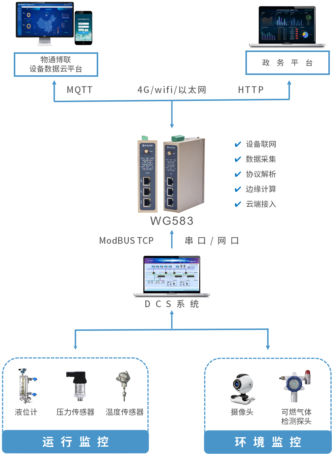 化工车间现场储罐、缓冲罐的温度、压力、液位传感器以及可燃气体检测探头由DCS系统进行控制,工业智能网关WG583只需采集DCS系统内的温度、压力、液位、可燃气体浓度等数据,并顺利获得4G/WIFI/以太网实时上传到监控平台(Modbus TCP转MQTT/HTTP)。管理者可以随时监控储罐、缓冲罐设备的温度、压力、液位及仓储可燃气体浓度等数据变化,并在异常故障时接收到报警通知,快速采取措施进行控制管理,保证设备正常工作和仓库环境安全。