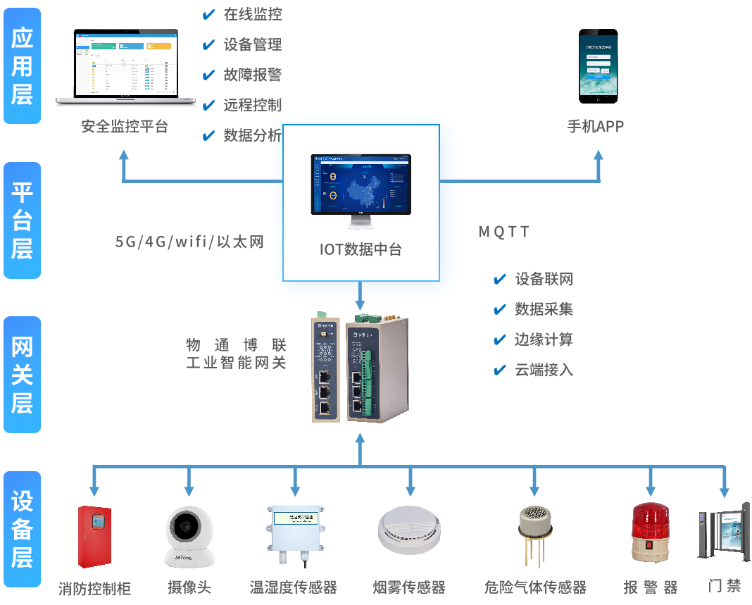yth游艇会yth206推出的化工安全监控预警系统集成了物联网技术、大数据分析、云计算等技术,实现对化工生产、仓储、运输全过程的实时监控和及时预警。顺利获得将温湿度传感器、危险气体传感器、压力计、PLC等设备接入到yth游艇会yth206工业智能网关中,实时采集设备参数并顺利获得5G/4G网络上传到yth游艇会yth206IOT数据中台,并将数据转发给企业监控平台或国家监管平台。