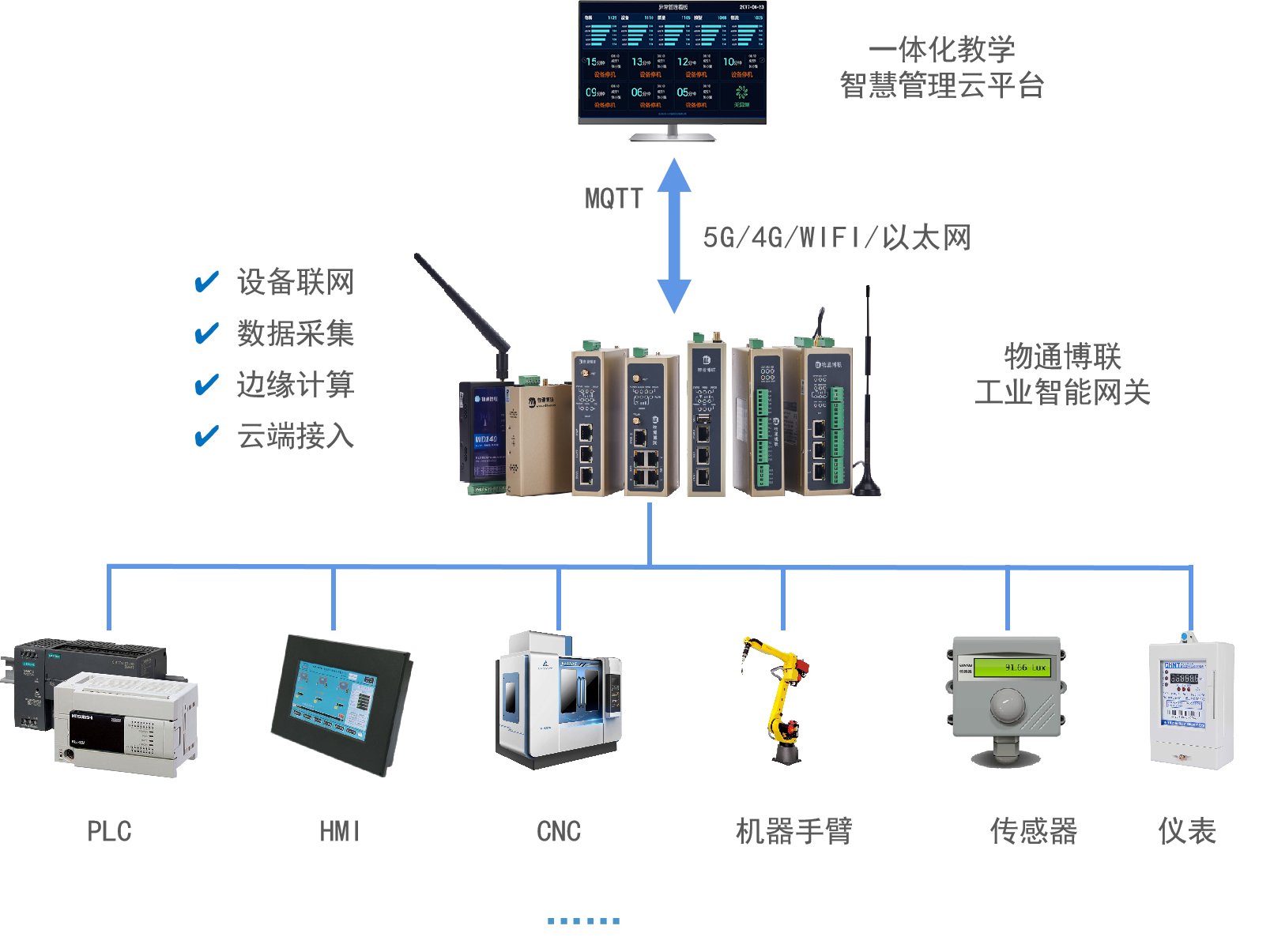 yth游艇会yth206WG系列工业智能网关是一款两化融合和边缘计算网关,具有丰富的物理接口,如RS232、RS485、以太网口、IO接口等,与实训平台的各种工业设备连接,解决接口不统一问题,内嵌丰富的工控协议和智能采集算法,实时采集设备数据,网关支持各种边缘计算功能如智能采集、数据过滤、报警计算、跳变触发、公式计算、分组策略、定时任务、算法开发等,顺利获得对设备的模型建立和数据标准化后,将数据顺利获得MQTT协议上传到一体化教学智慧管理云平台,帮助平台实现各类工业设备数据的无缝接入、高效整合与精准应用,为提升实训效果给予了强有力的技术支撑。