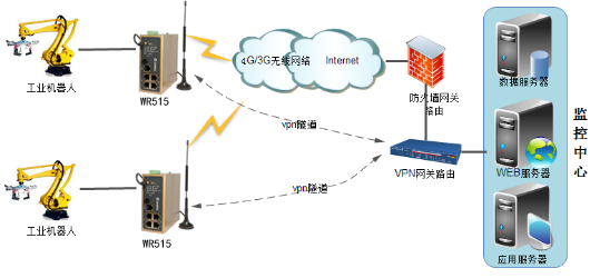 监控中心端采用ADSL/光纤接入Internet 公网,获取固定公网ip。搭建vpn服务器。yth游艇会yth206工业无线路由WR515做vpn客户端和服务器建立vpn隧道,实现两端内网互通。数据库服务器上运行采集系统,可以采集工业无线路由WR515下接的以太网plc数据以及工业机器人数据,从而达到采集监控工业机器人运行状态目的。