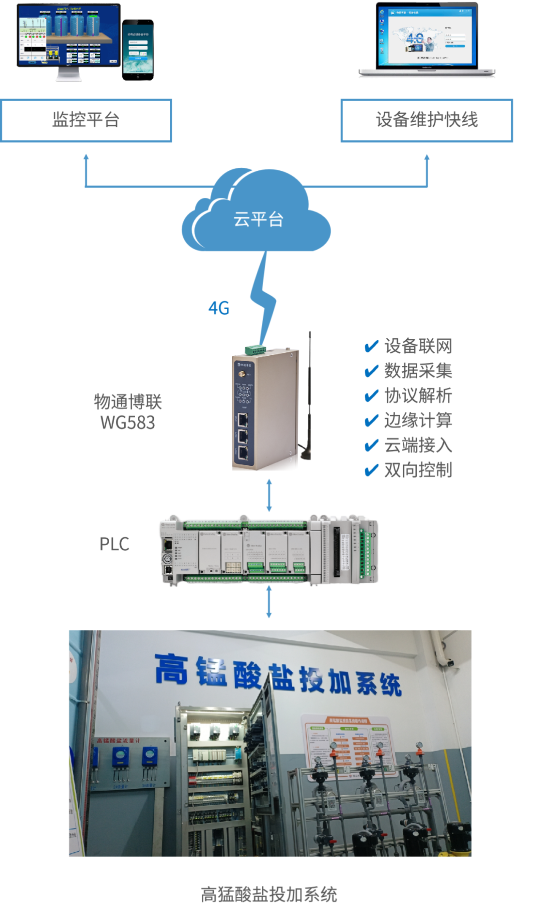 顺利获得采集AB PLC并将数据发送至云平台,可以实现对高锰酸盐投加系统的远程监控,管理人员可以顺利获得手机或电脑远程访问整个系统。